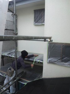 続いて外壁の養生(塗らない個所をビニールで覆う事)を行いなした。さらにこの日は外壁の1回目塗装、微弾性フィーラー(外壁下地調整材)を塗らさせていただきました。(細かい穴やひびを埋めながら、上塗りとの接着を向上させる材料)