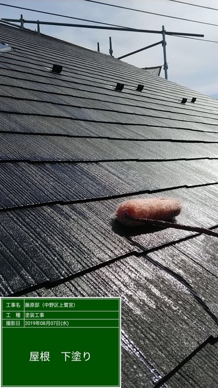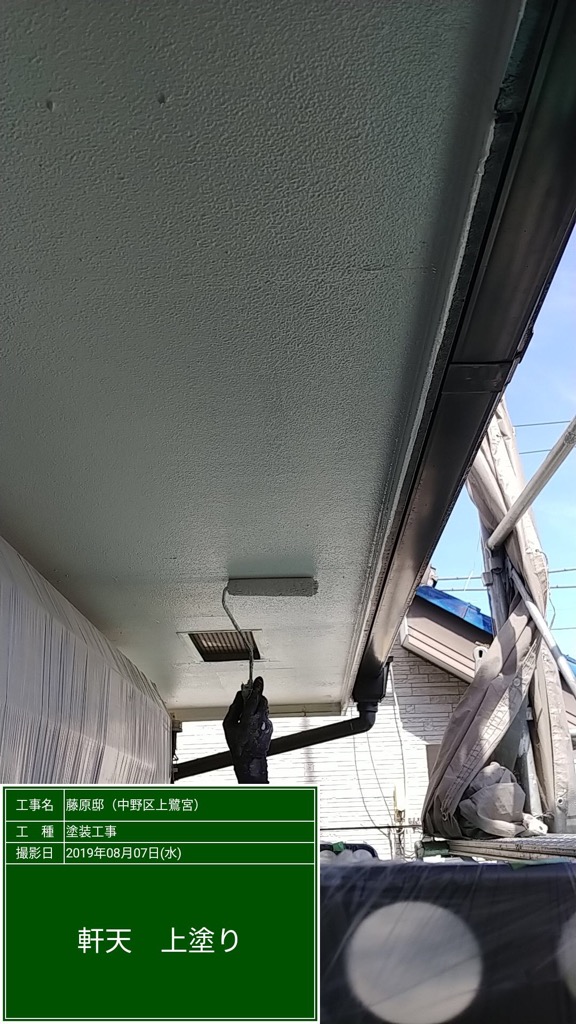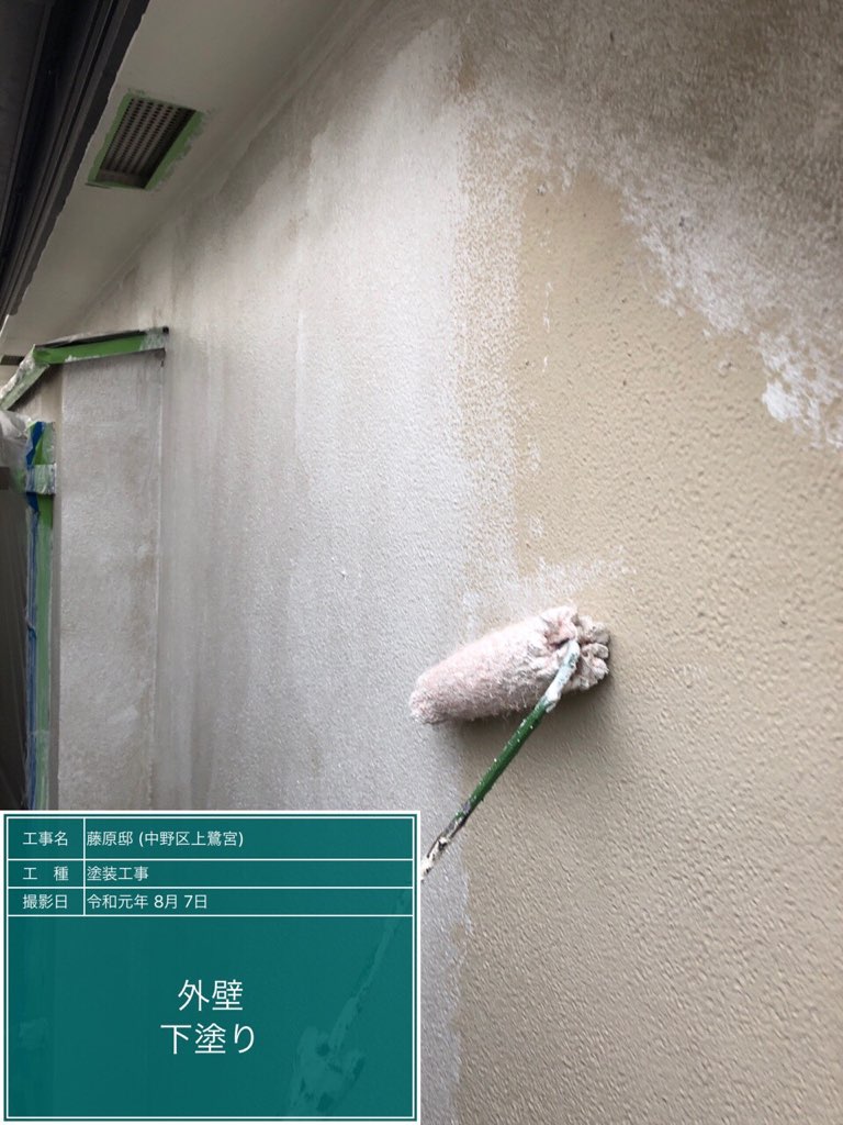 上壁 下塗りフィーラー塗装及びモルタル補修部砂骨ローラーにてパターン塗装。