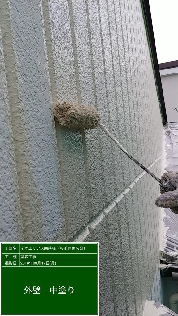 外壁中塗り塗装 パーフェクトトップ 色番号ND104にて塗布。