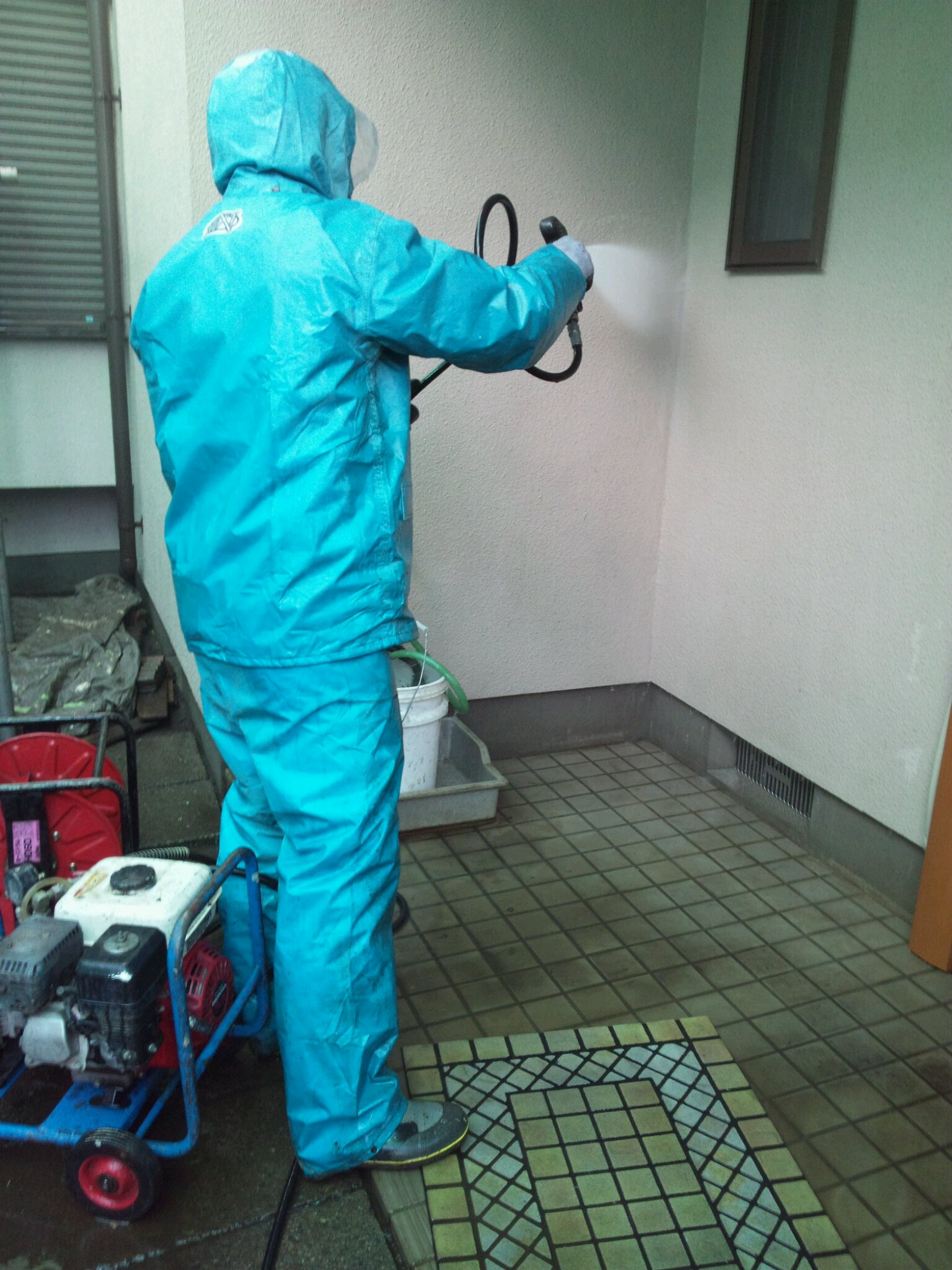 高圧洗浄の順番で施工いたしまして、少し時間がありましたので、乾いている個所から養生をさせていただきました。