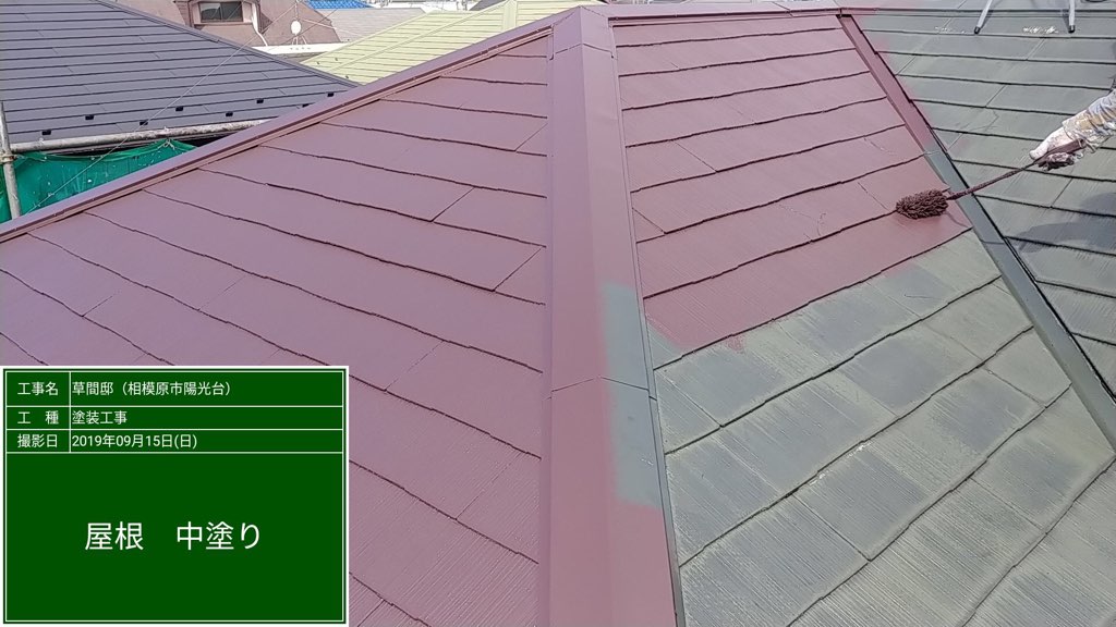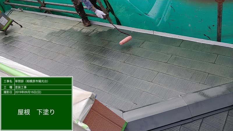 コロニアル屋根 プライマー塗装及びヤネフレッシュによる中塗り塗装。