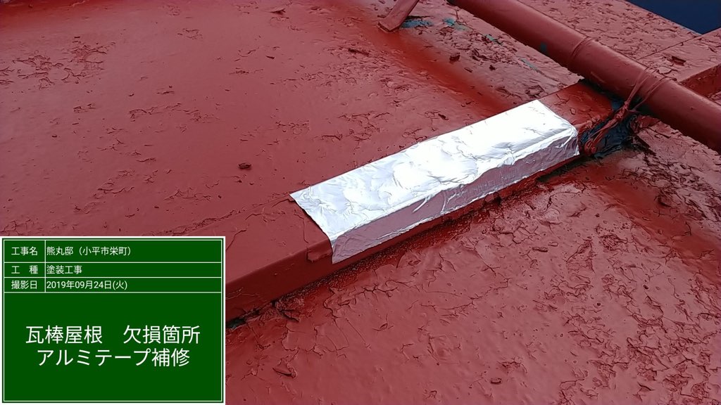 劣化により穴が開いている部分があり、補修用のアルミテープを付けました。