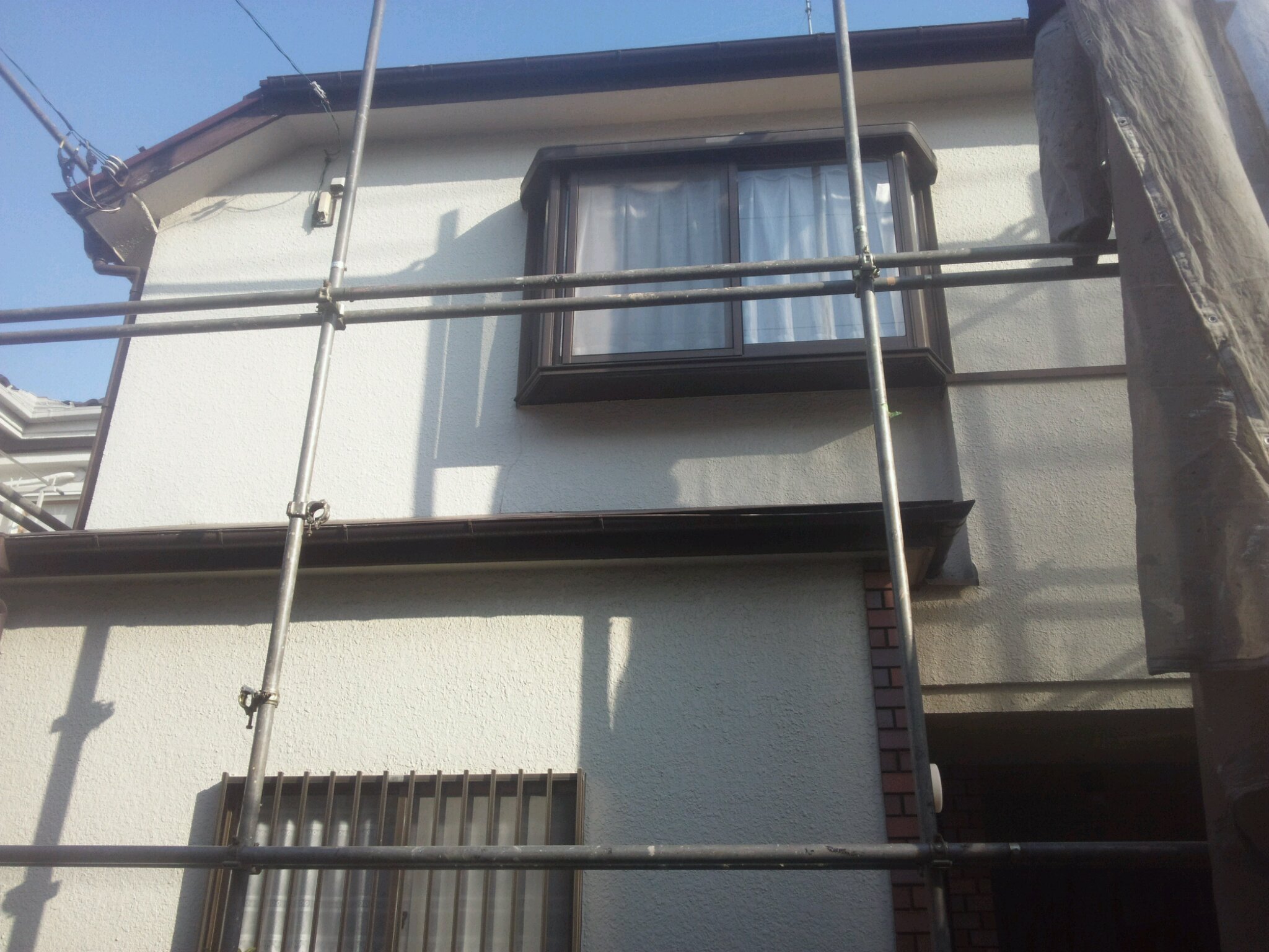 まずは、2棟分の足場組み立て。ご近所様とかなり隣接しているので、飛散その他注意しながら今後作業していきたいと思います。