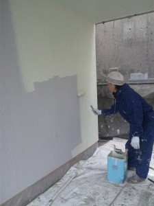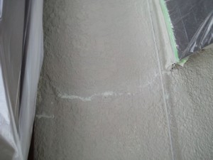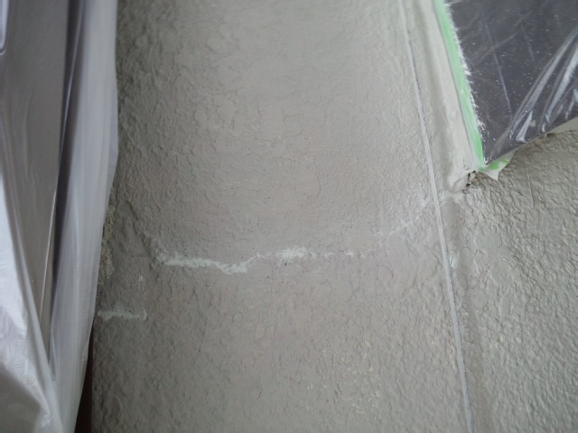 下地処理材 微弾性フィーラーを入れたあと、まずクラック(ひび)や穴の補修です。写真のように専用充填剤にて跡が残らないようにひびに埋めていきます。