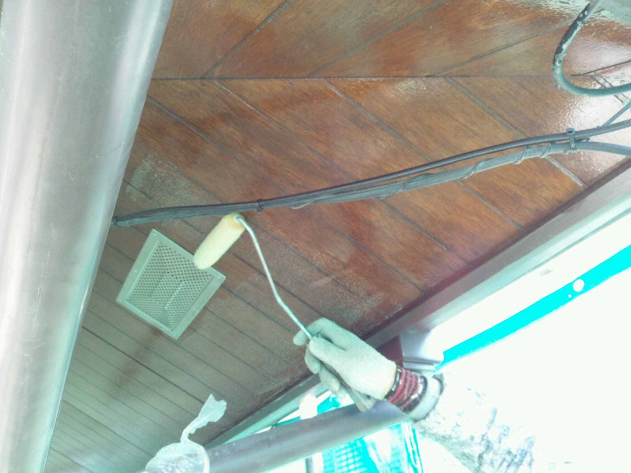 乾き待ちの間に軒天(写真のように今回は木部クリアー仕上げの天井です)のクリアー塗りをさせていただきました。