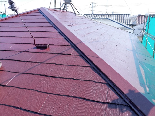 コロニアル屋根 プライマー塗装。中塗り及び上塗り塗装 シリコンベスト チョコレート色。