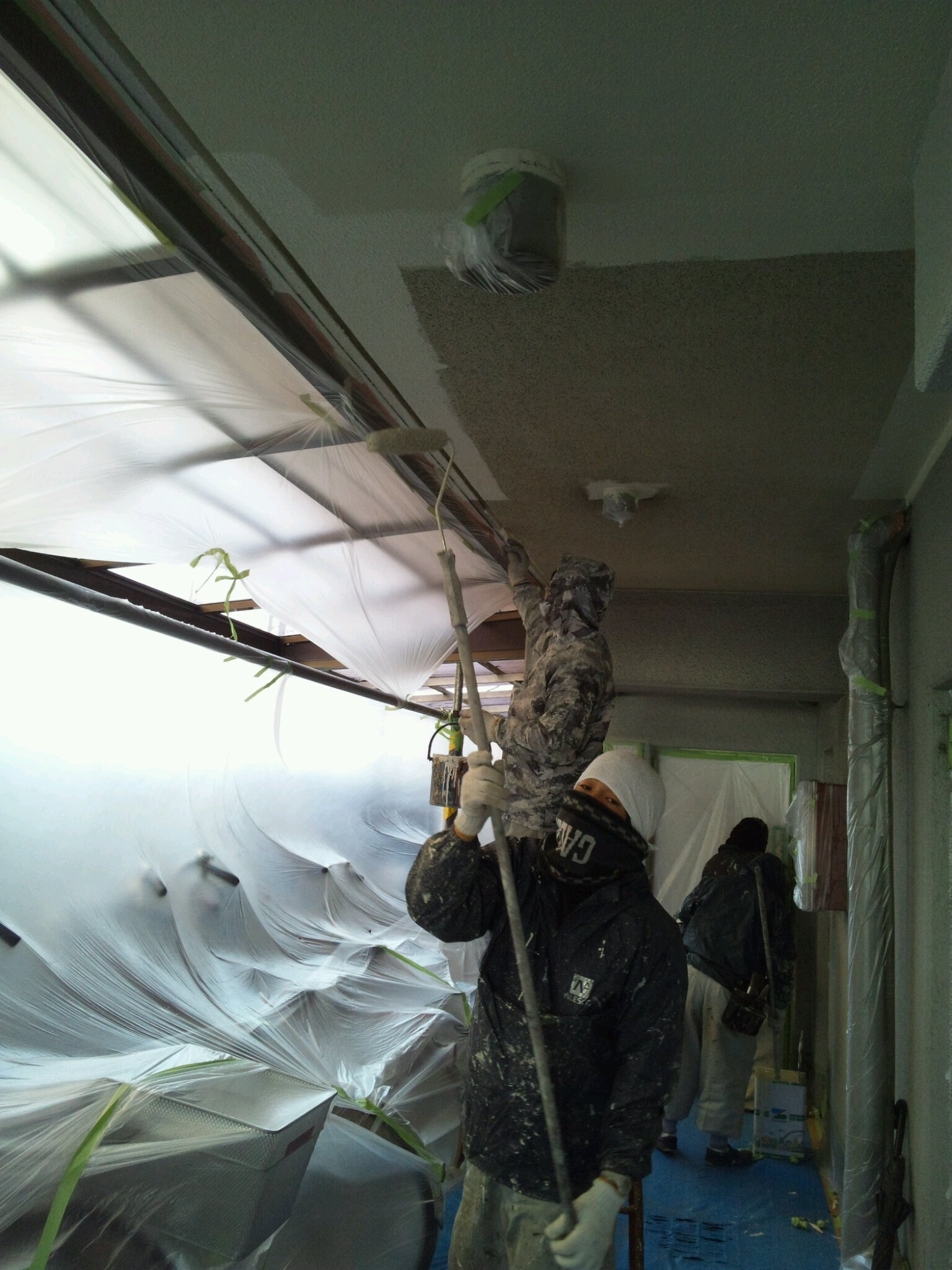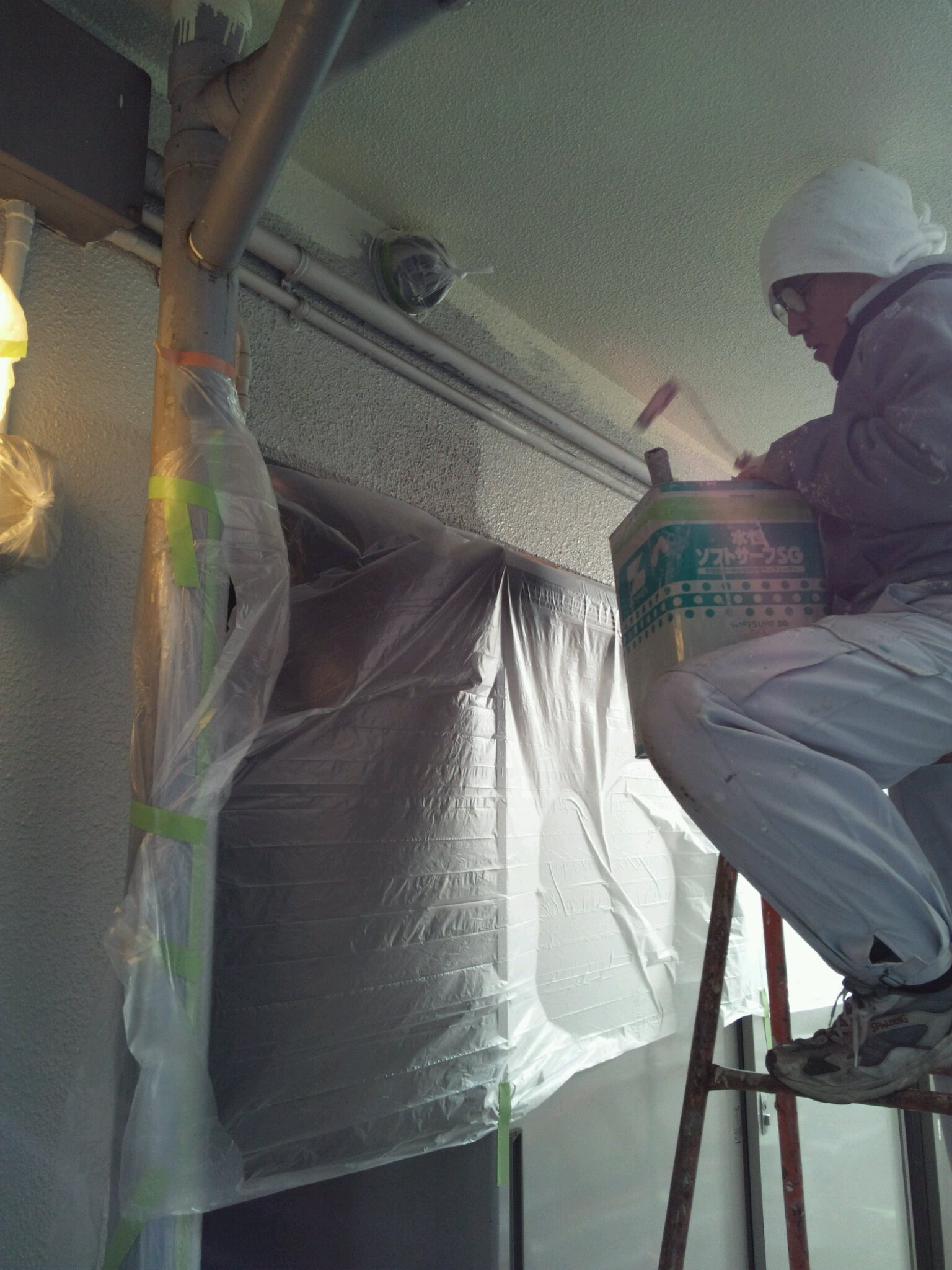 細かなドレーンパイプや出窓の天場や下場。共用廊下の天井と塗装させていただきました。