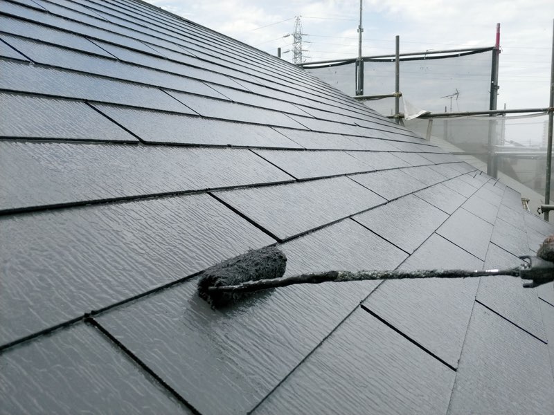 コロニアル屋根 上塗り サーモアイ ダークグレー色塗装。