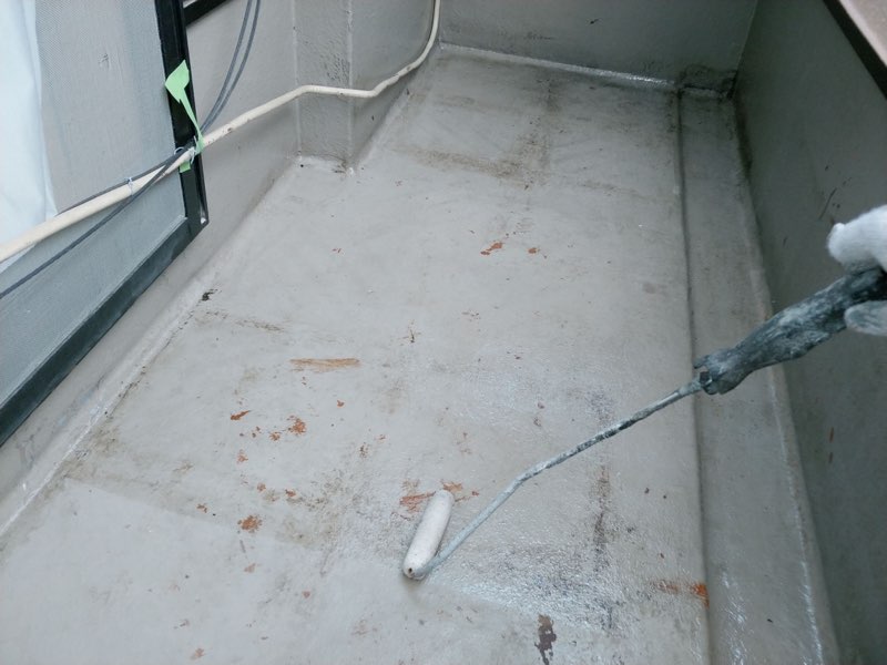 ベランダ床防水トップ塗装 プライマー塗布及びトップコート塗装。