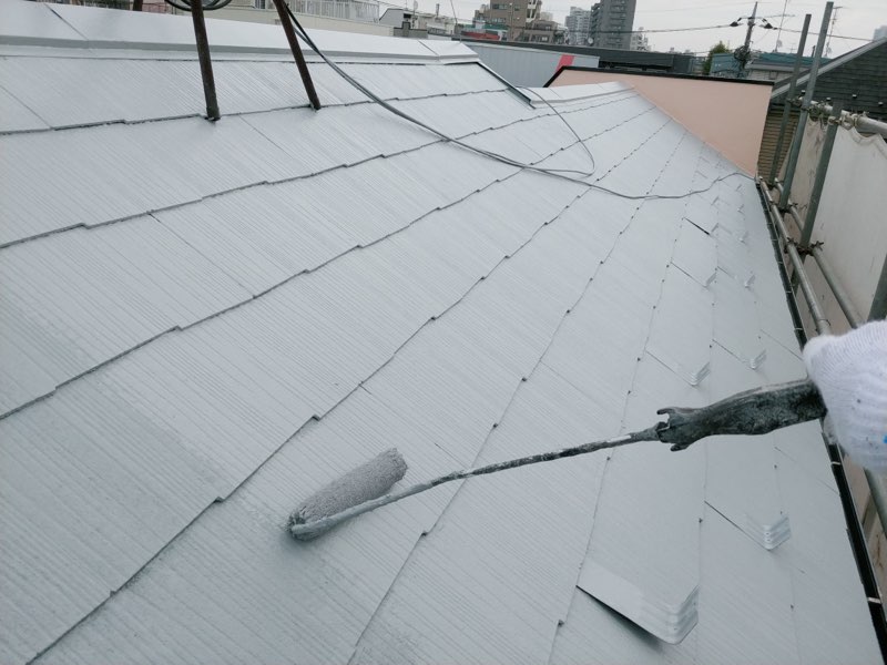 コロニアル屋根 上塗り塗装 ライトグレー色。