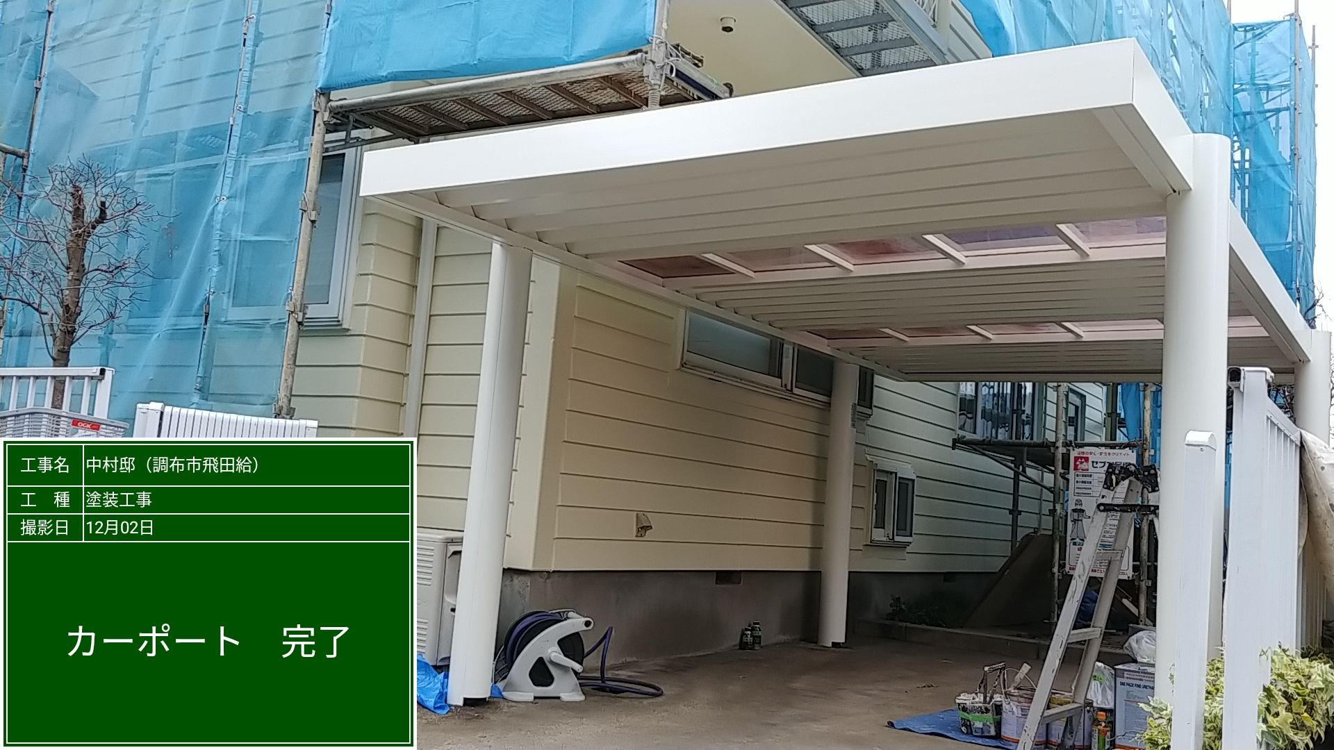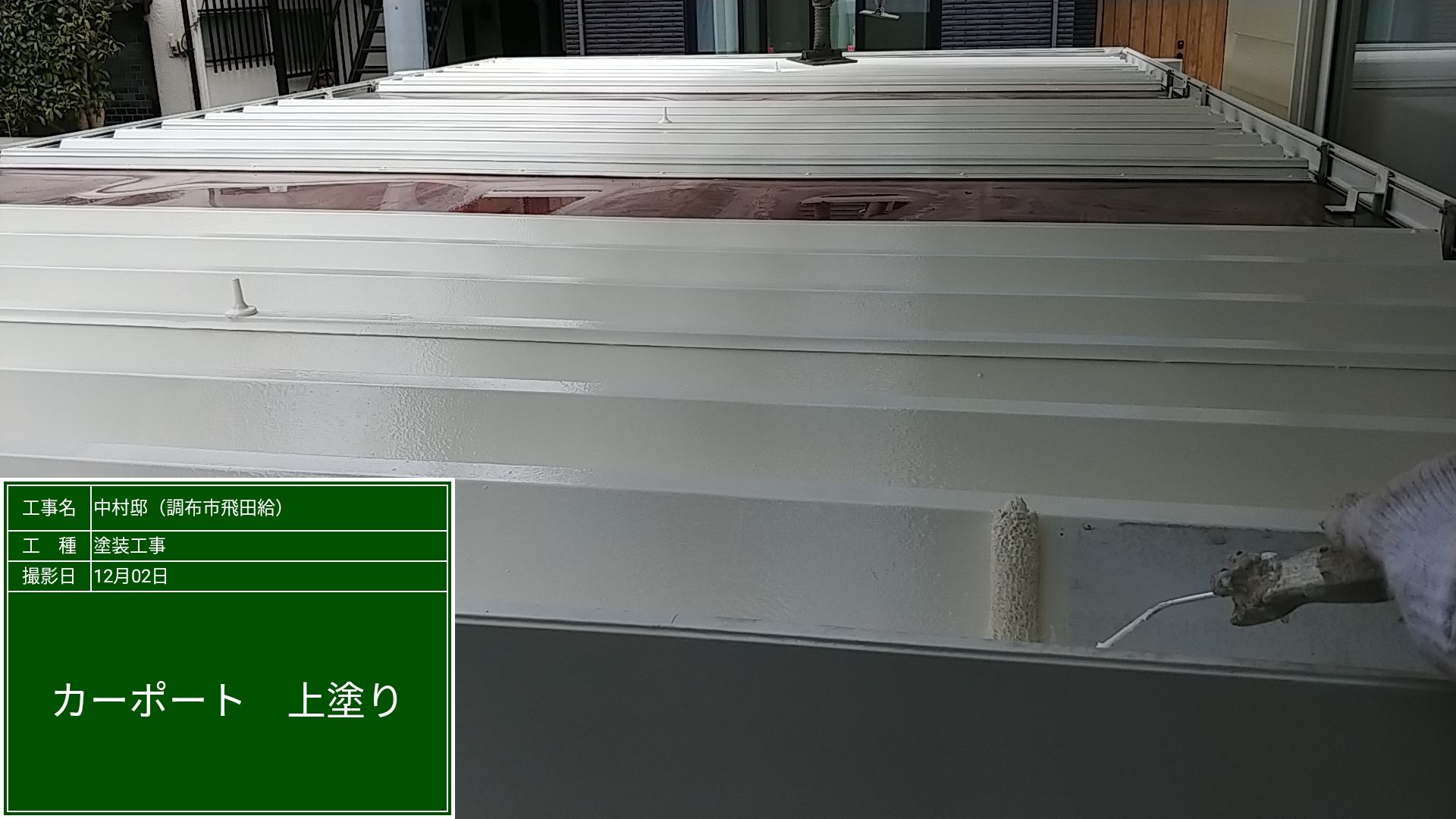 カーポート上塗り塗装 ファインウレタン アイボリー色。