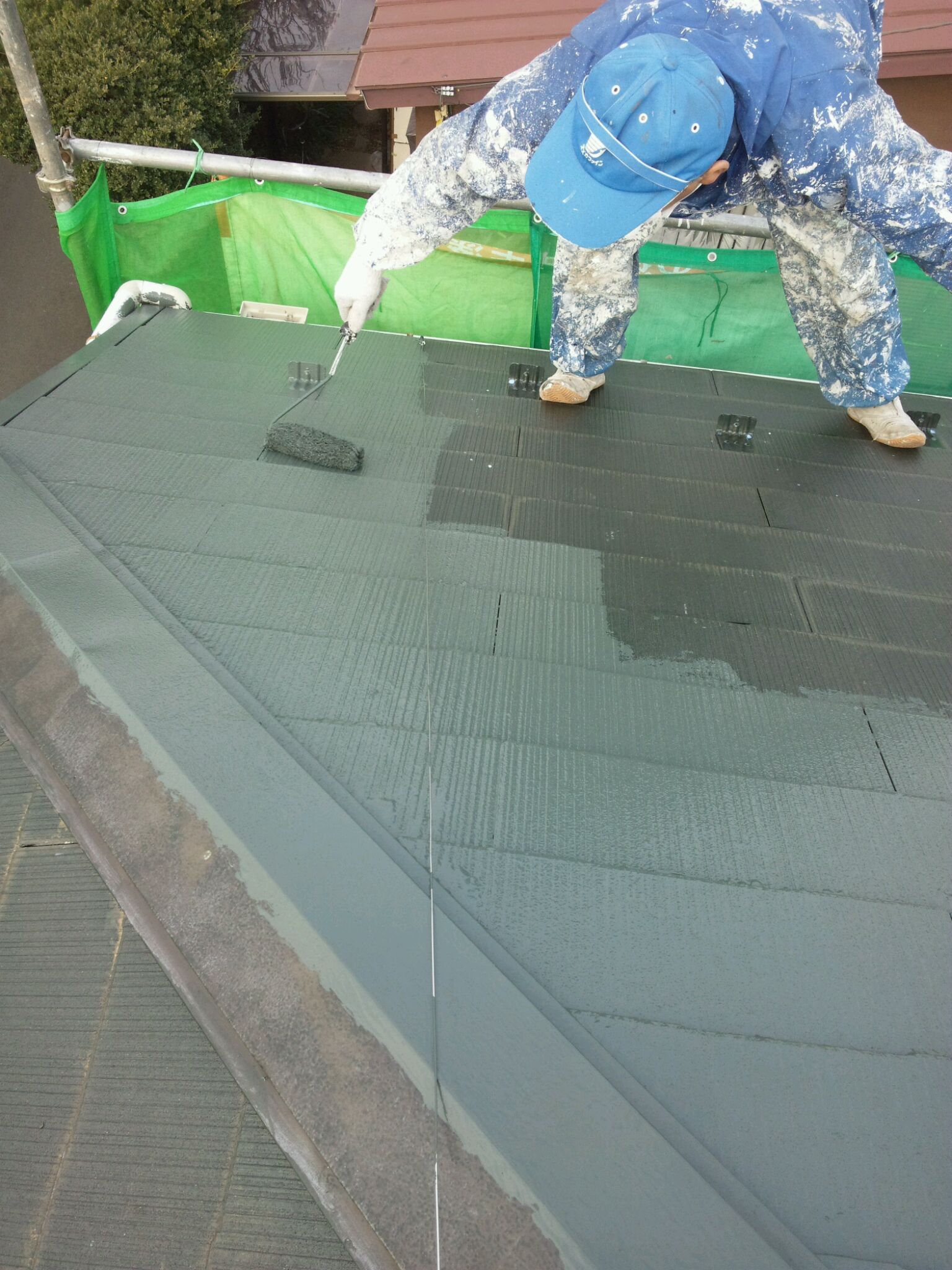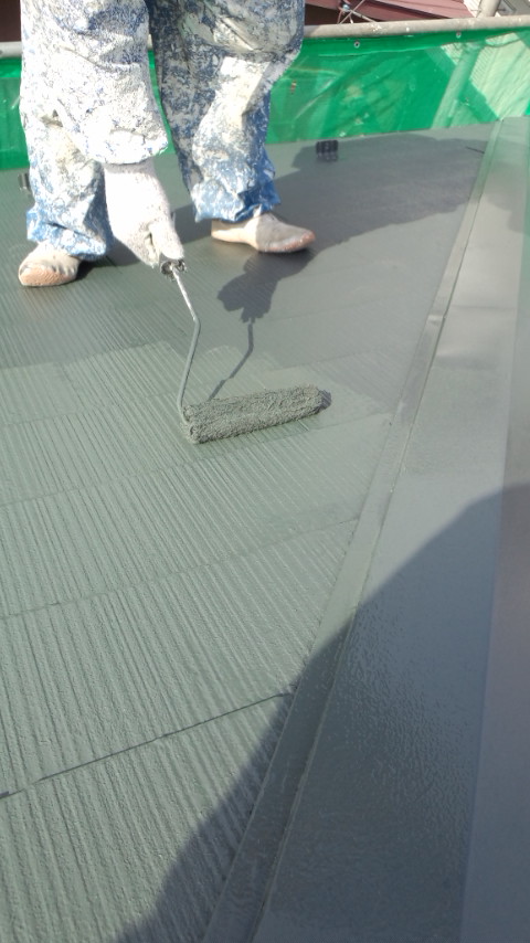 本日の作業内容は、コロニアル屋根の中塗り及び上塗り。