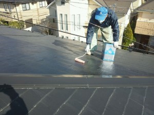 続いてコロニアルの大屋根及び下屋根のプライマー塗り。それが終わるとヤネフレッシュによる中塗り。