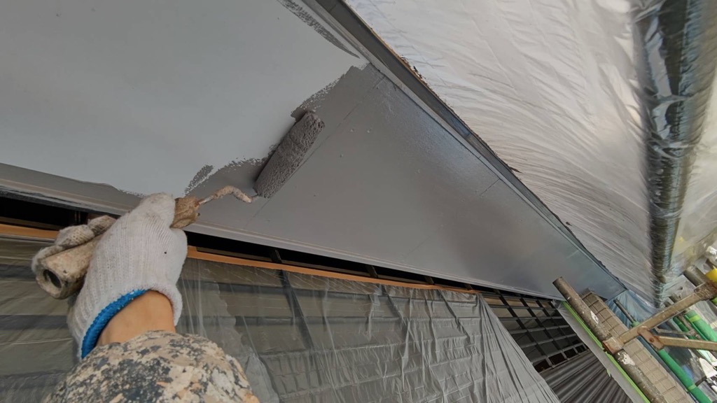 外壁養生作業、下塗り、中塗り上塗り塗装。