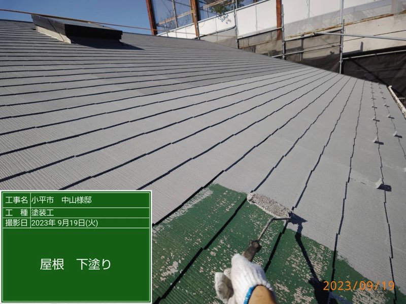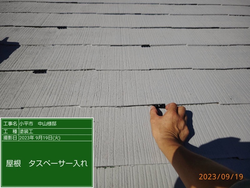屋根 下塗り及びタスペーサー工事。