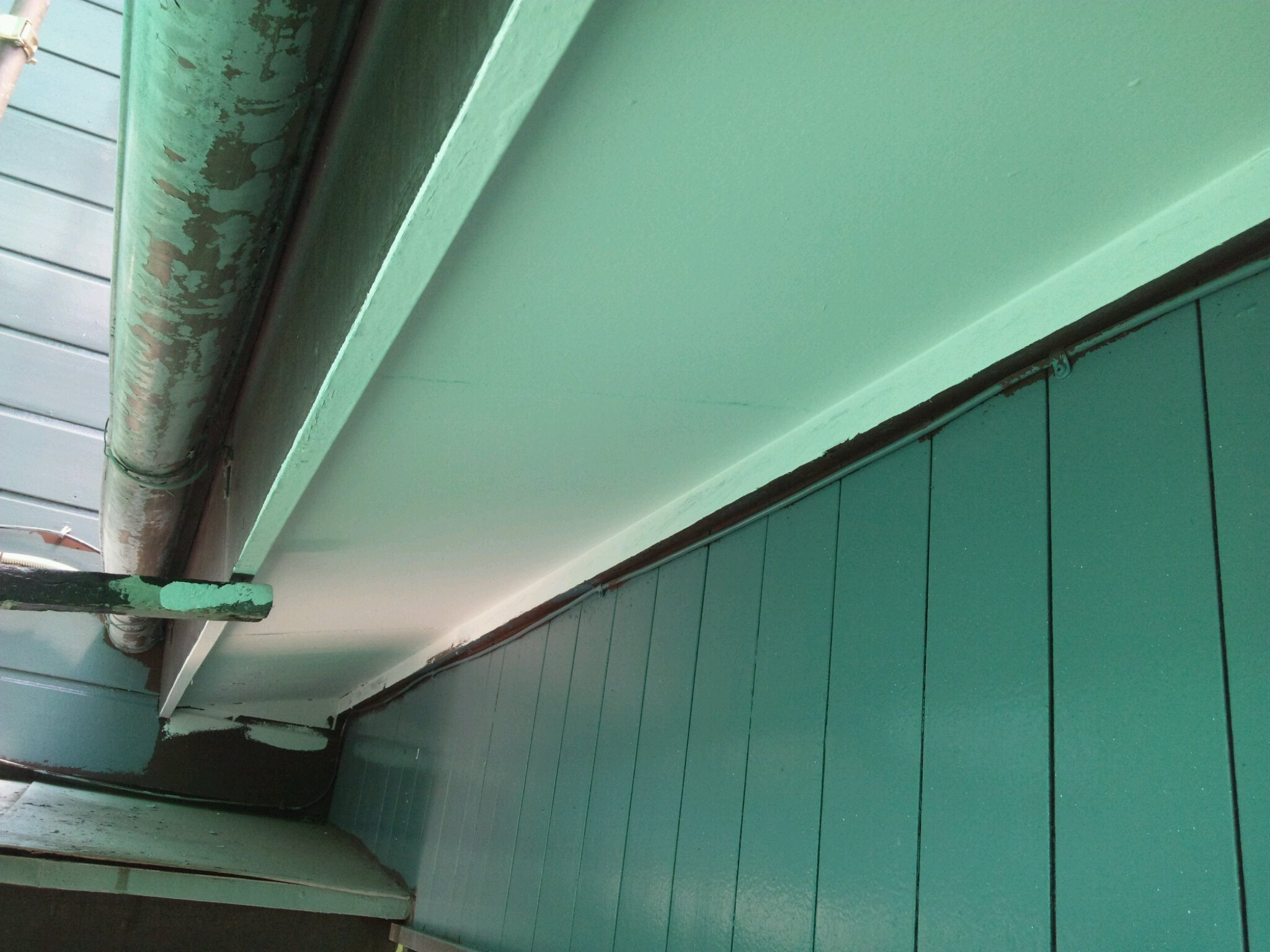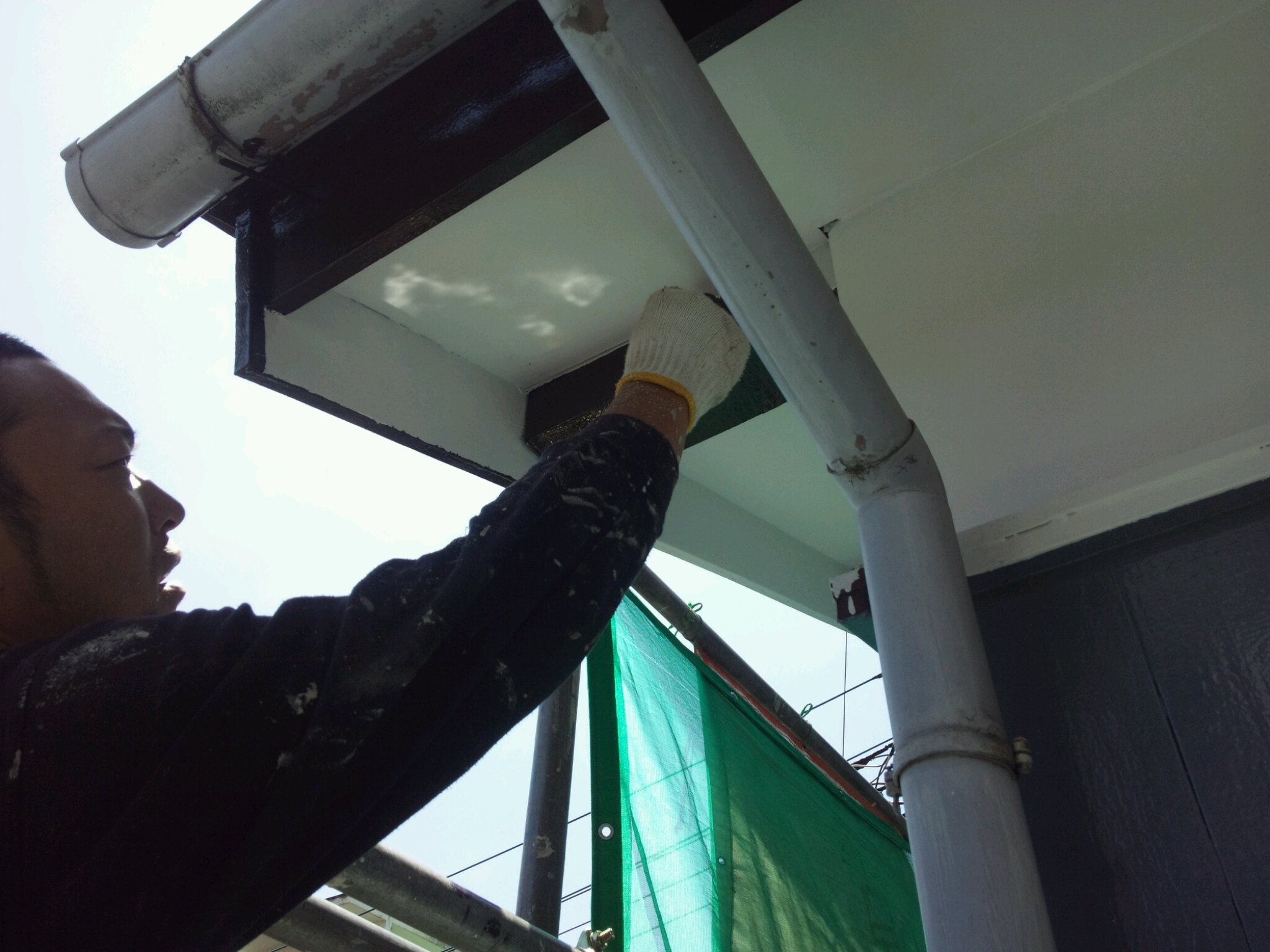 まず、軒天や漆喰の小壁の塗装。かなり傷んでおり、けれんがけが大変でした。