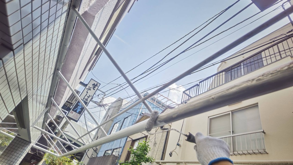 テント鉄骨 けれん作業、さび止め及び上塗り塗装