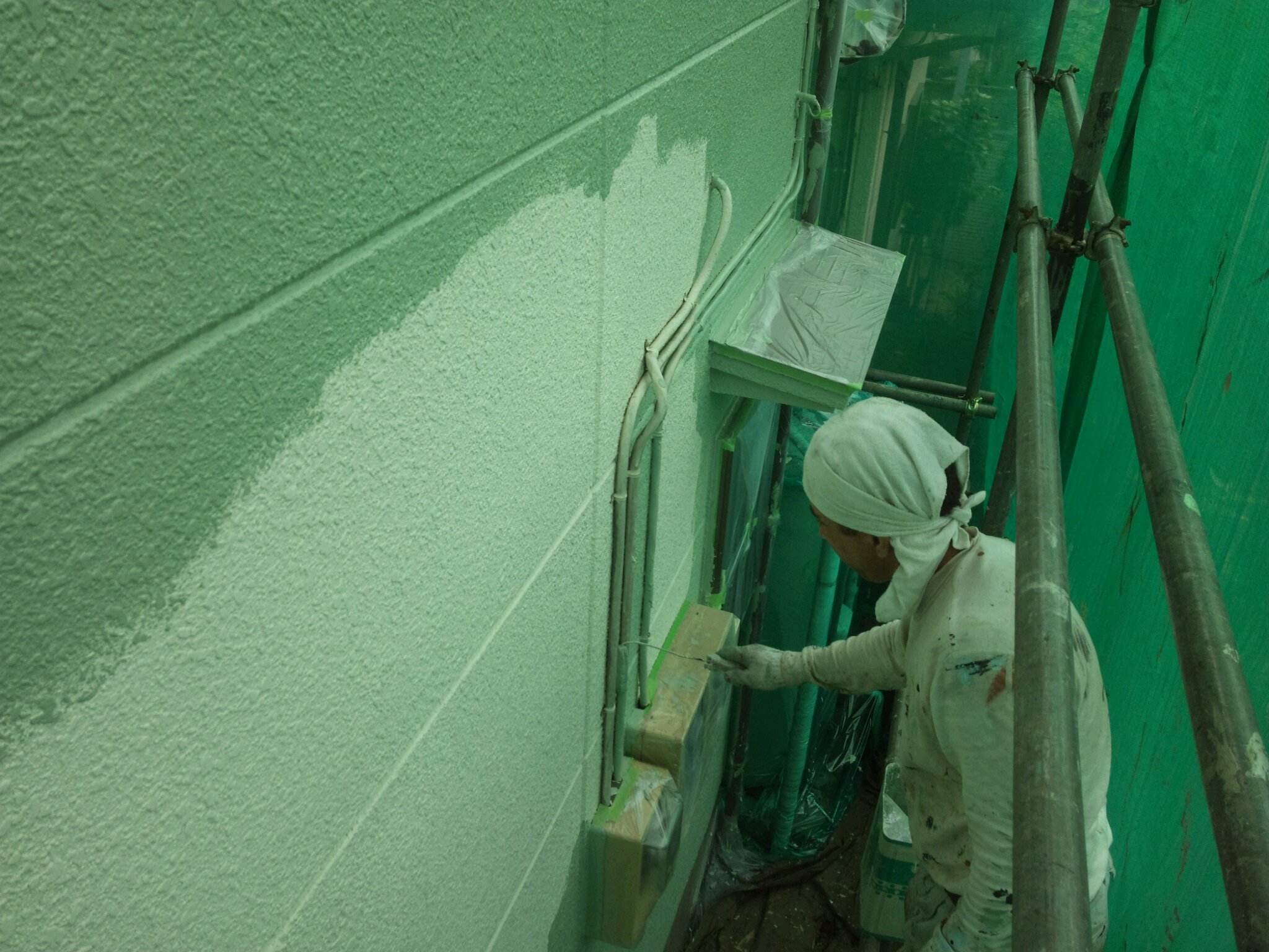 外壁のコンディションは思いのほか良くありませんでした。劣化が激しく、下塗りがかなり吸い込みました。