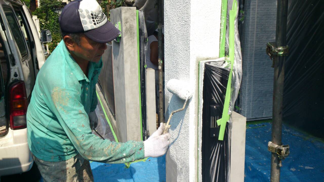 作業内容は、セラミシリコンによる外壁の中塗り、及び同材料の上塗りが途中まで。