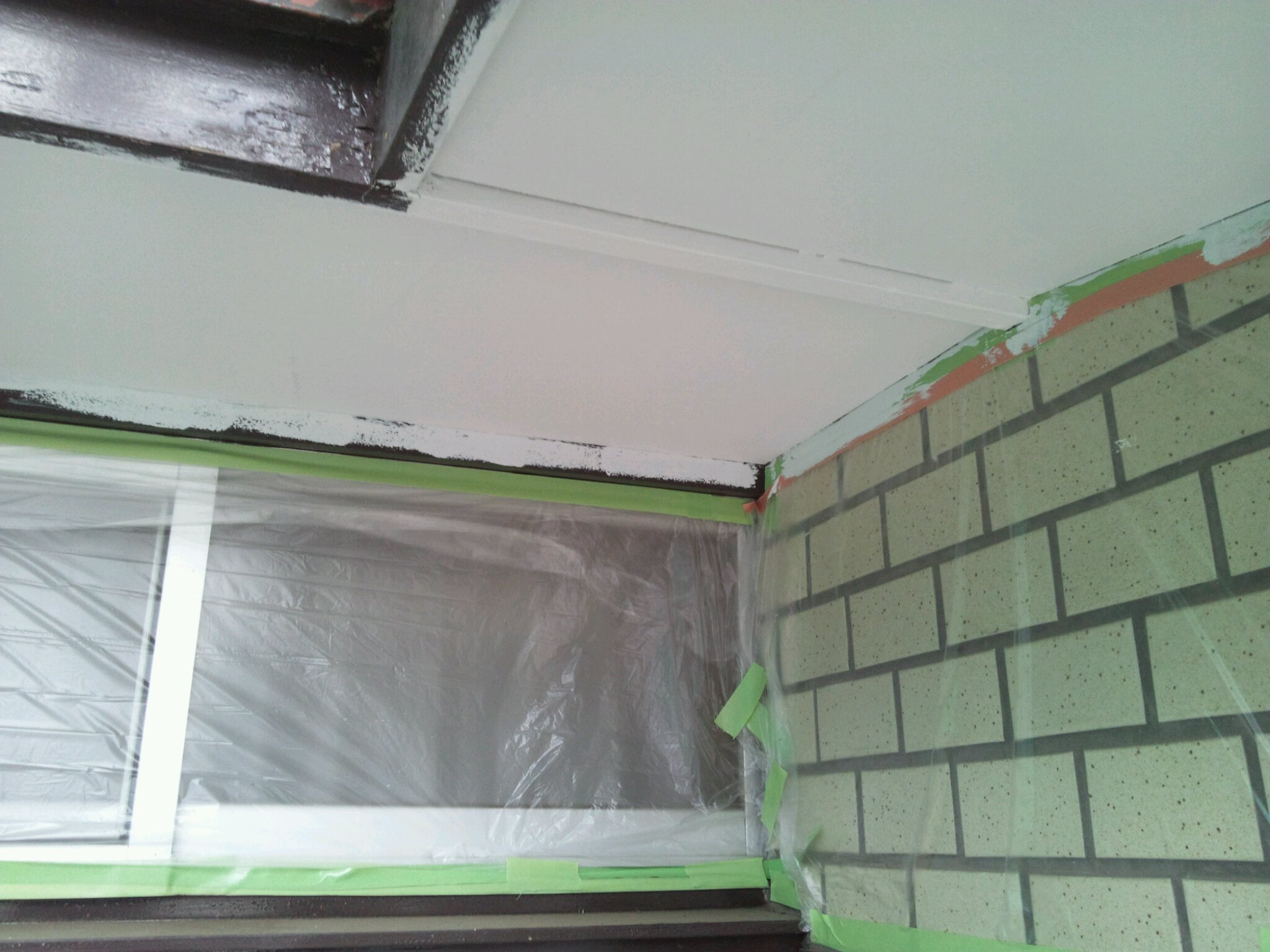 養生、そして軒天の塗装。ケイカル板等の軒天は透湿性能が良い材料で塗るのが一般的です。