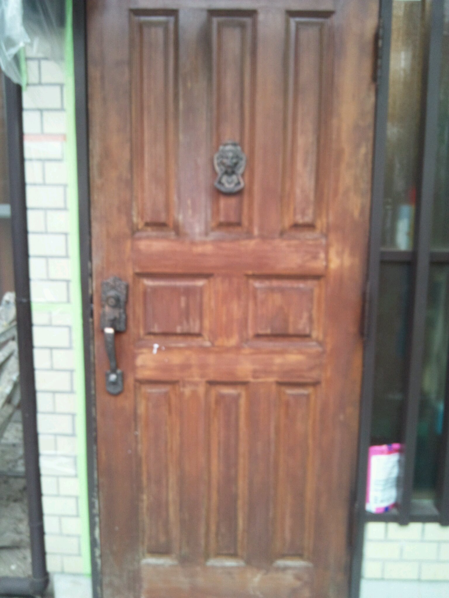 玄関ドアの旧塗装を薬品を使い剥離いたします。さらに漂泊をして白木に戻します。これで塗装の下準備が完了です。右の写真は施工前のものです。
