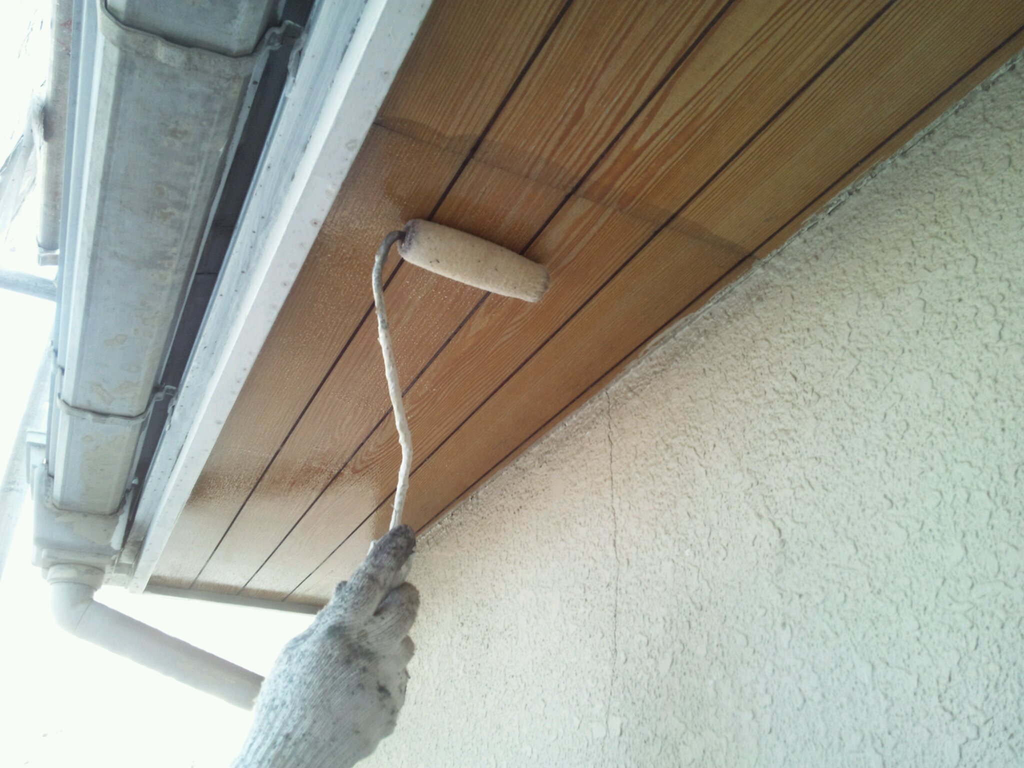 今回の軒天がピーリング板(木目プリントの化粧板)の為、クリアーでの塗装になります。ですので外壁の前にまずウレタンクリアー(つや有)で塗装になります。