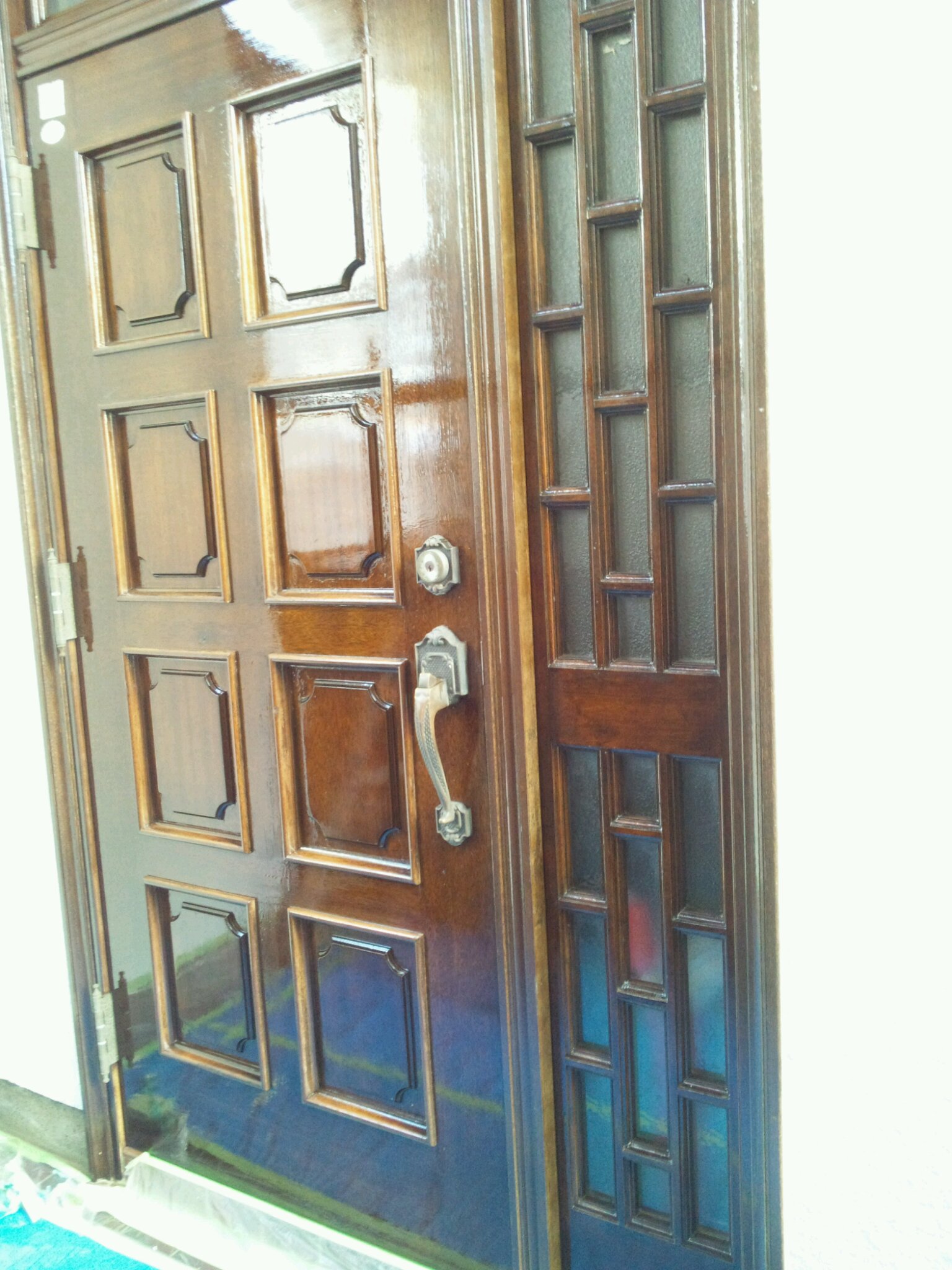 まずは玄関ドア。色落ちしている個所を補修して、中塗りのクリアー塗布。その後ウレタンクリアーで仕上げました。