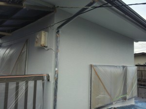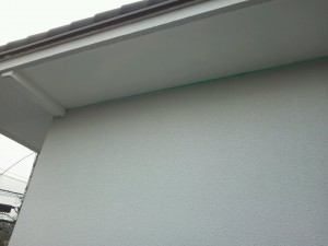 軒裏の塗装。外壁の中塗りおよび上塗りとさせていただきました。