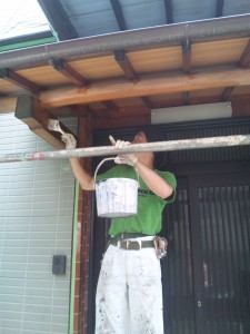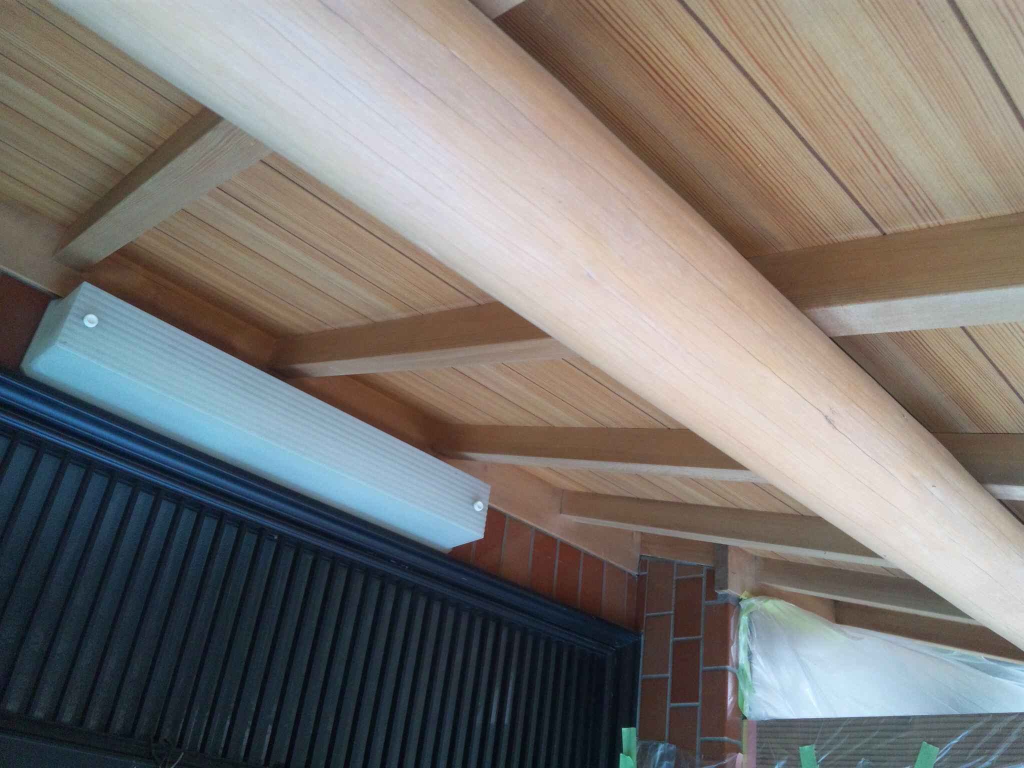 まず、玄関の木部 もや垂木の漂泊です。灰汁洗いをして水で洗い、今度は漂白剤で漂泊をして再度水洗い。