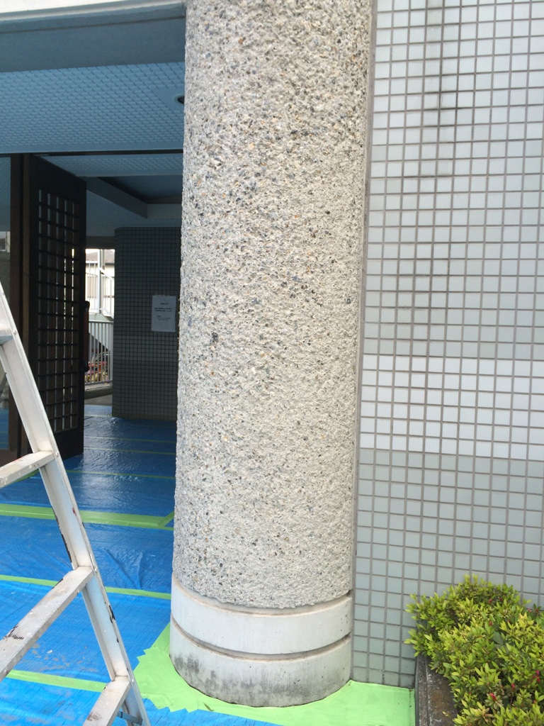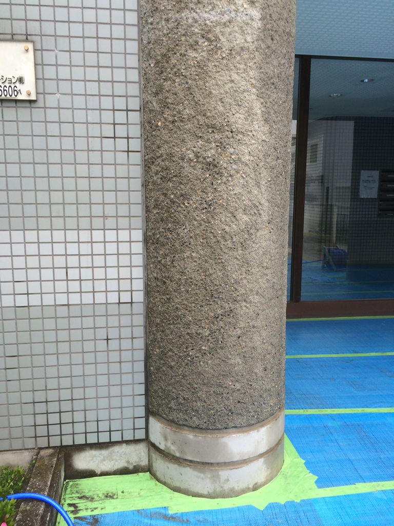 エントランスの打放しの柱や壁の漂白剤による洗浄。