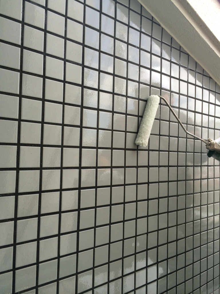 東及び西面のタイル壁 クリアーコートの中塗り、上塗り。