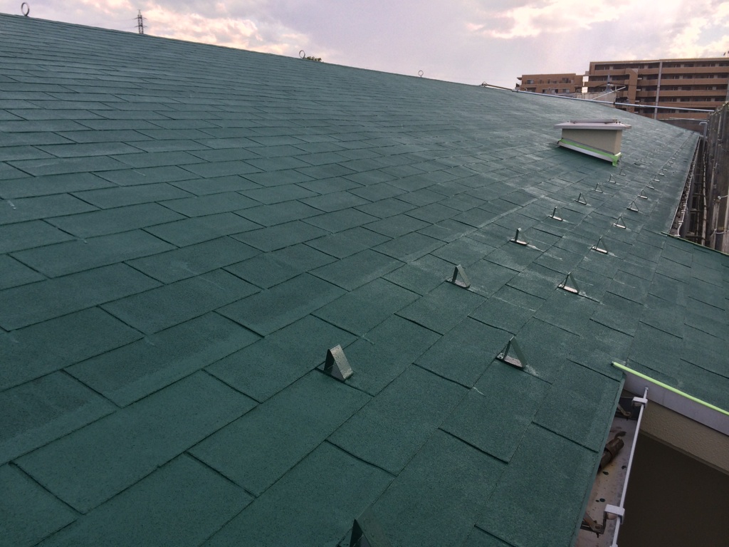 コロニアル屋根の中塗りをヤネフレッシュにて塗装。