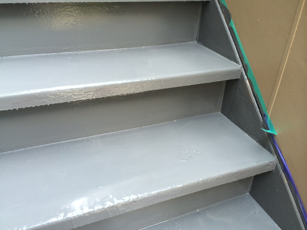 階段床部分のシートを外した為、滑らずなおかつ錆びないような工法での、鉄骨塗装です。