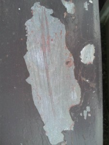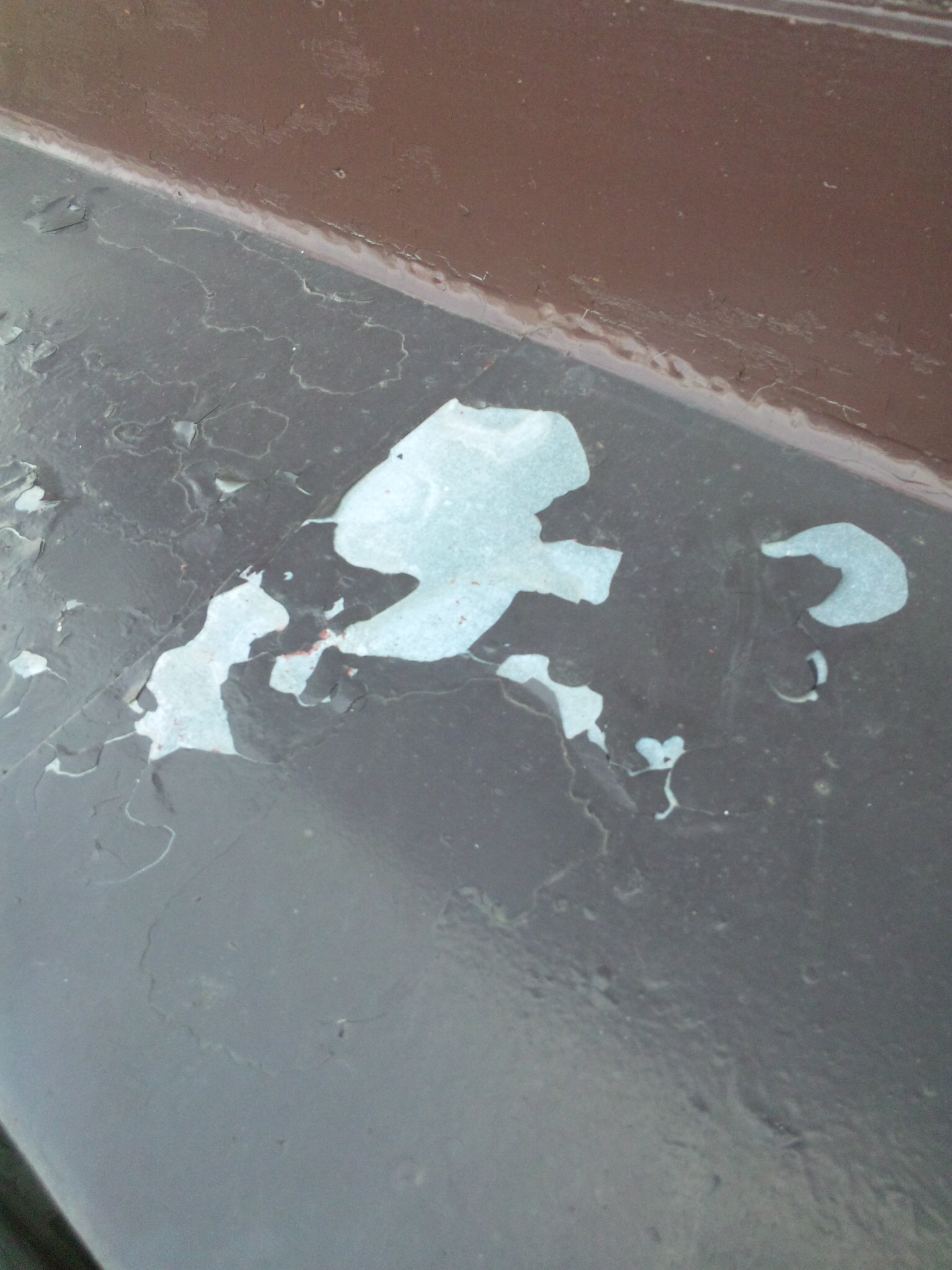 写真の部分ですが、この霧除け(庇)は亜鉛板という種類の鉄板です。この種のものは、無塗装の時に何かの処理をしておかないと、塗装が付着いたしません。
