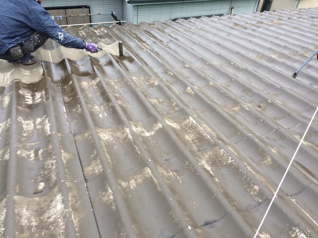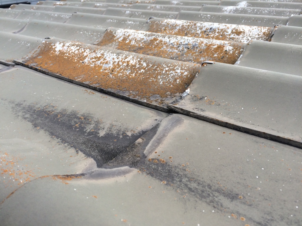 追加工事で大屋根のユーカワラも塗装になりました。カビが生え、塗装膜が剥がれており劣化が顕著でした。