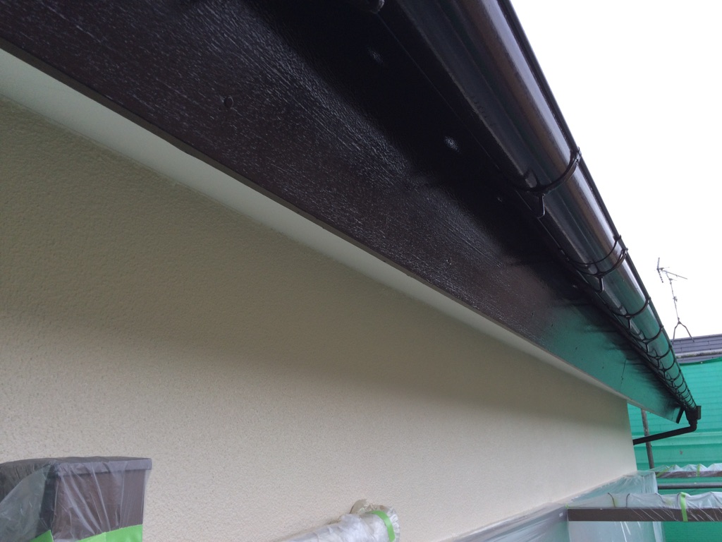 破風板及び雨樋塗装をマイルドシリコン 色ココナツブラウンにて塗装。