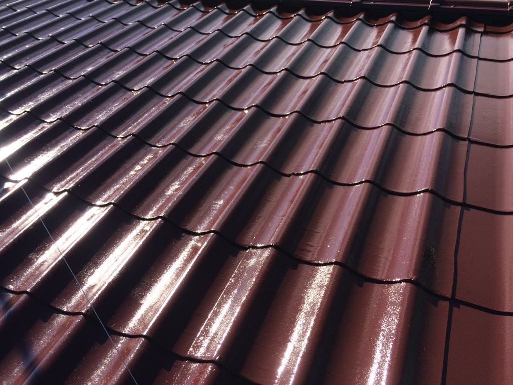 大屋根ユーカワラの中塗り、上塗りをヤネフレッシュにて塗装。