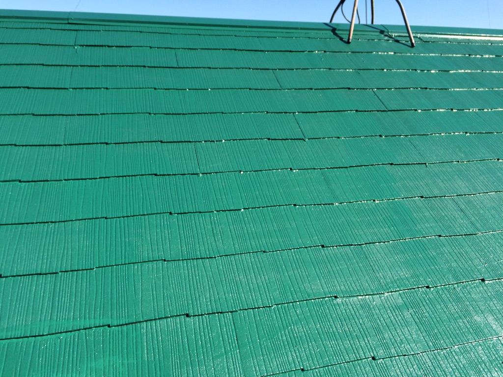 コロニアル屋根 ヤネフレッシュ中塗り及び上塗り 色番号 ディープグリーン。