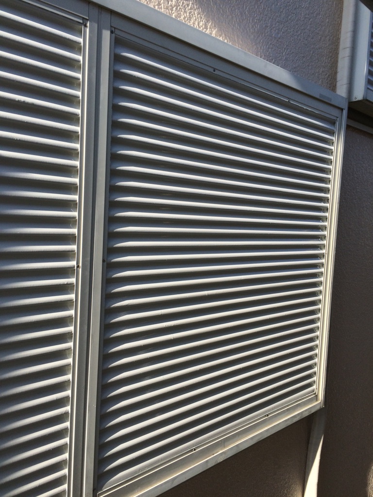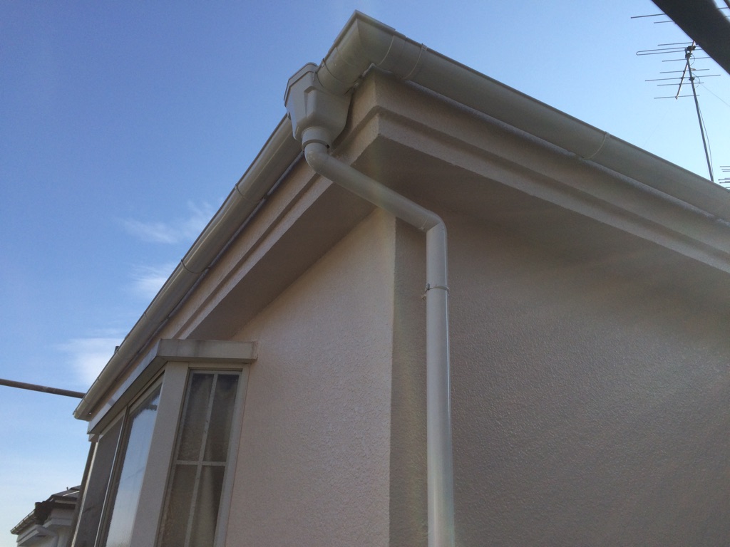 養生をはずしながら、雨樋、トタン霧除け等、鋼製 雨戸・戸袋の塗装をマイルドシリコン 色は現状のアイボリー系。