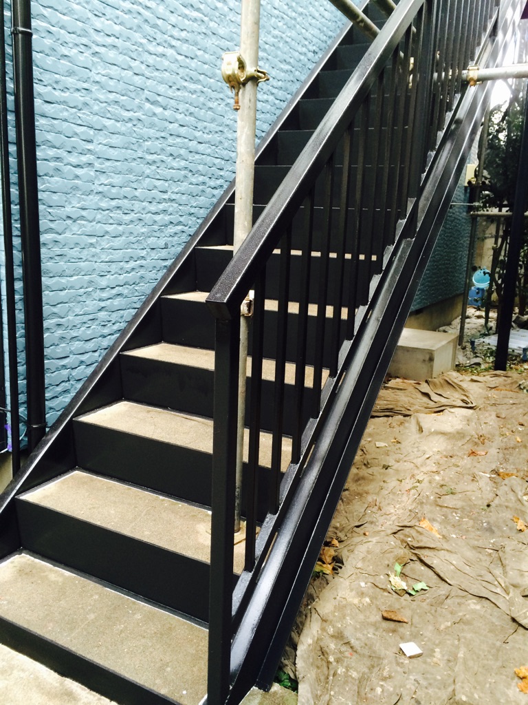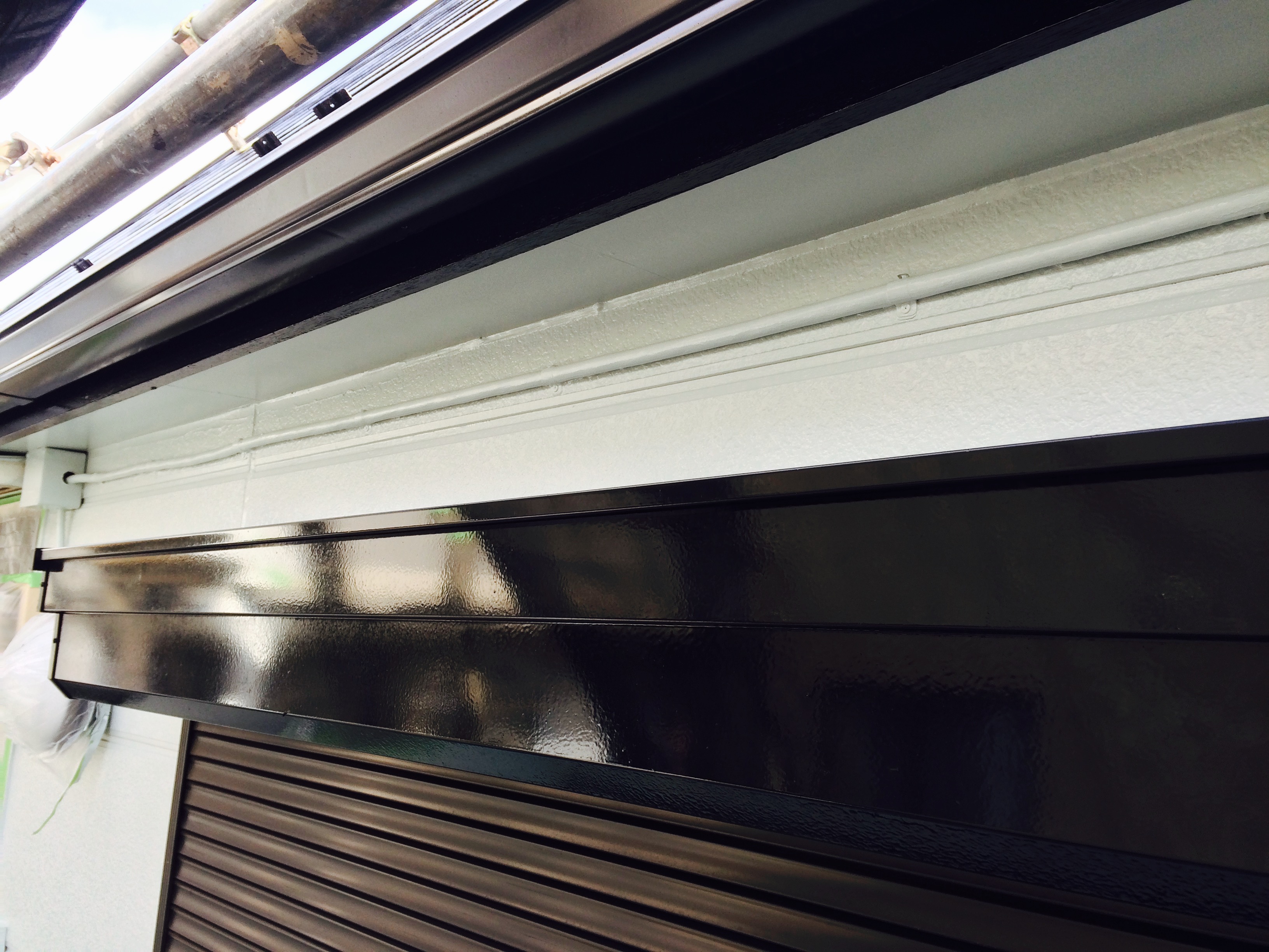 養生を外しながら、破風板、雨樋、シャッターボックス及び鉄骨階段を黒色のマイルドシリコンにて塗装。