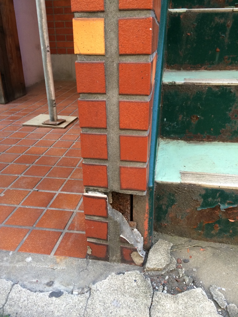 階段ののぼり口のタイル部の破損。これも、地震や経年劣化によるものだと思います。