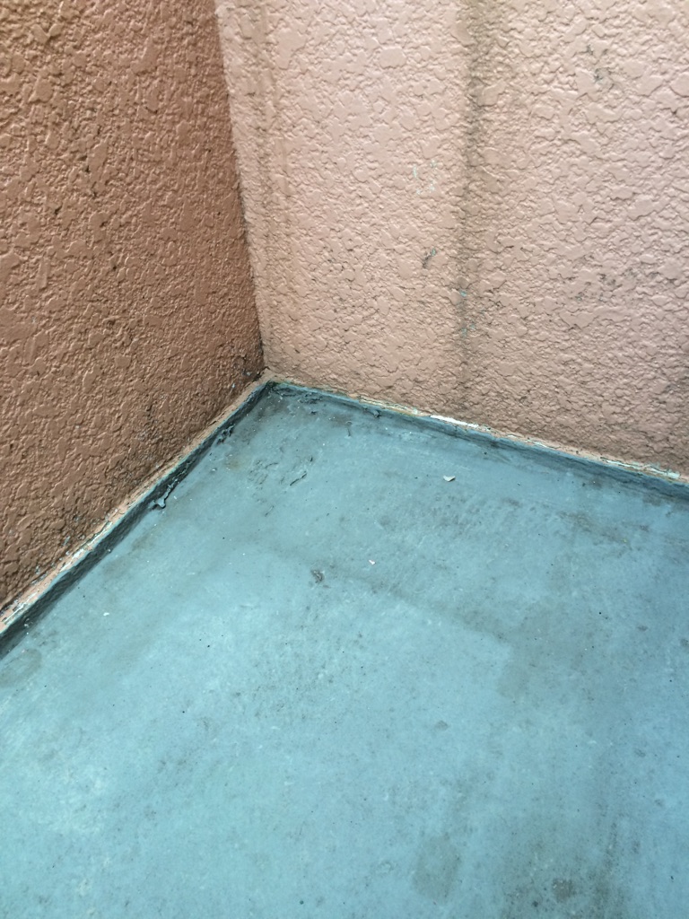 防水層は劣化している上にシーリング等の処理が悪く、雨漏れほ原因はそのあたりだと推測されます。