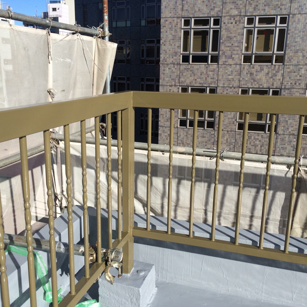 屋上~5階及び階段の手すりの上塗り塗装。マイルドシリコン色番号F25-40D。