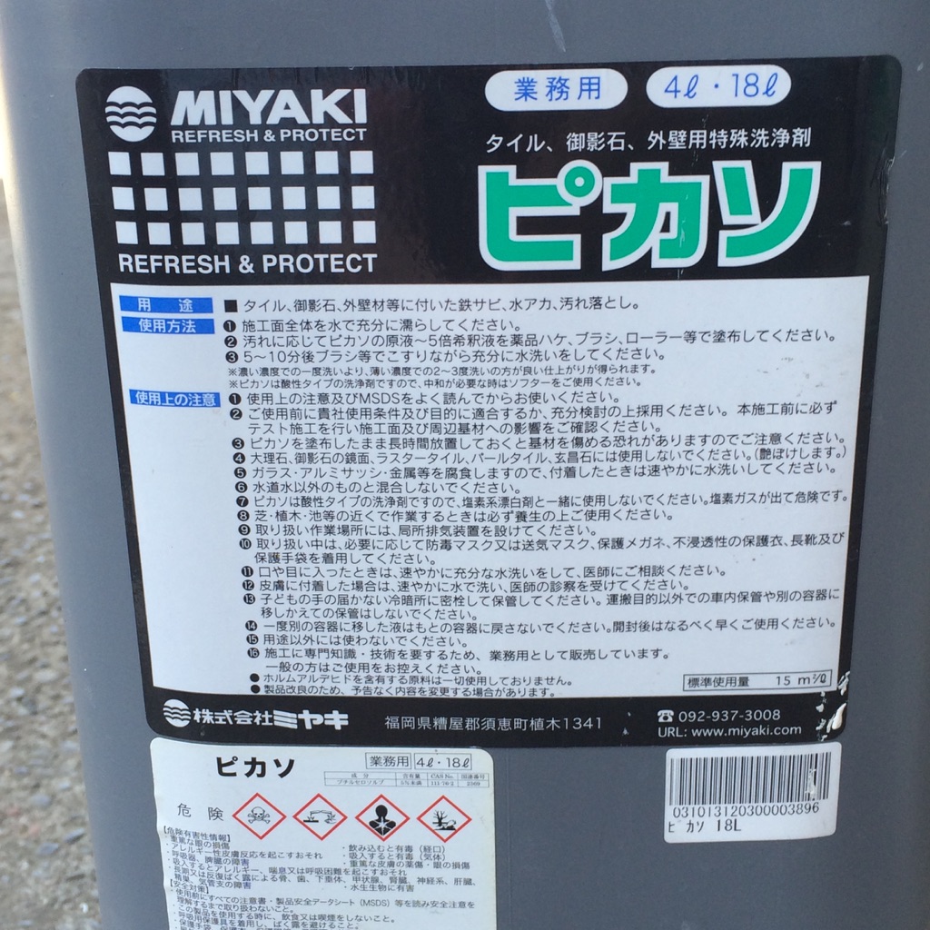 薬品(ピカソ)を使い、汚れを充分浮かしながらスポンジにて洗いながします。