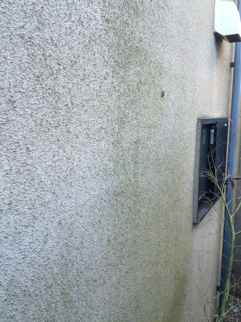 元々が、リシンの吹き付け壁のせいで汚れがつきやすく、壁全体が黒ずんでシミになっております。