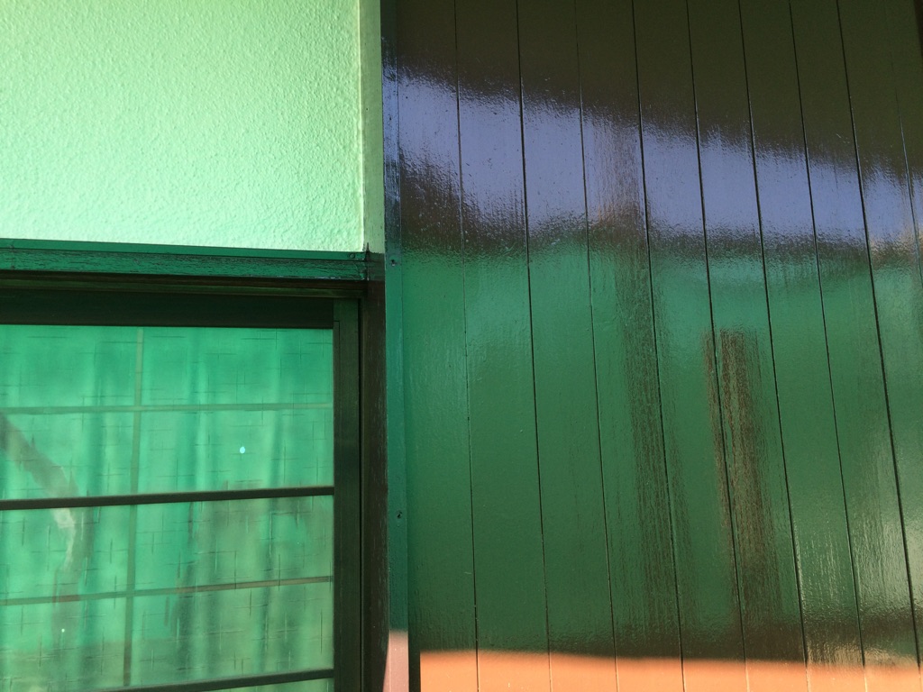 下見板、戸袋、破風板、木枠の2階部分の塗装をマイルドシリコンにて。