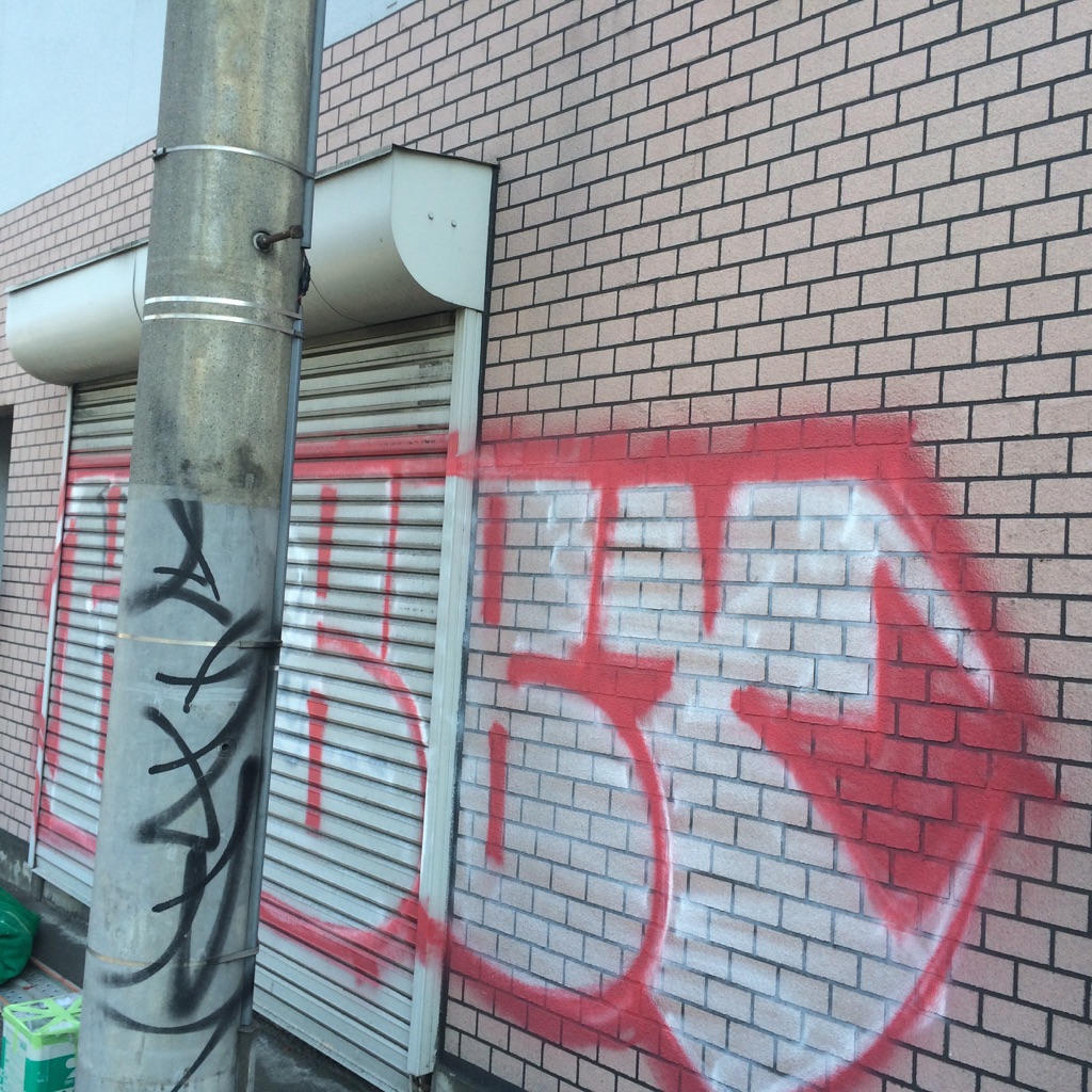 以前、タイル調の吹き付け塗装をいたしましたが、いたずら書きをされた部分の補修塗装になります。