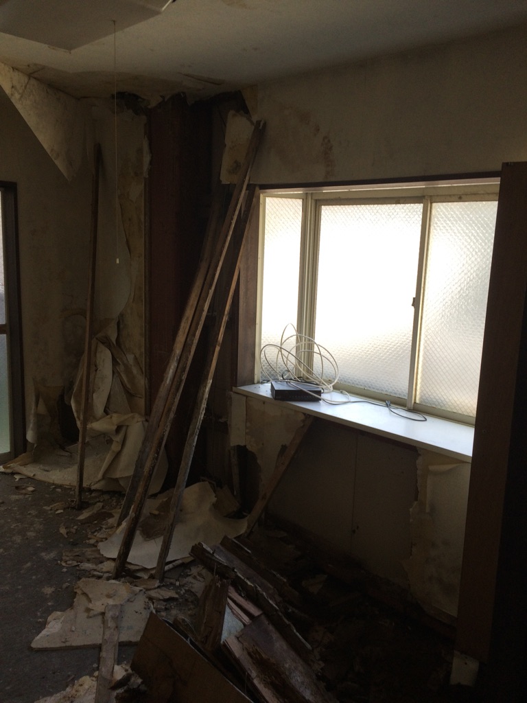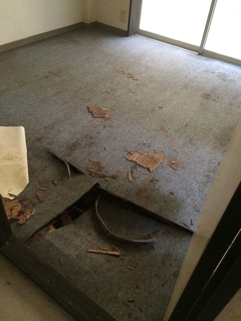 漏水のせいで床も落ちております。