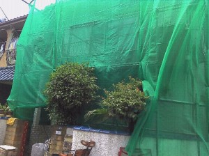 まずは足場組み付け、メッシュシート張り。