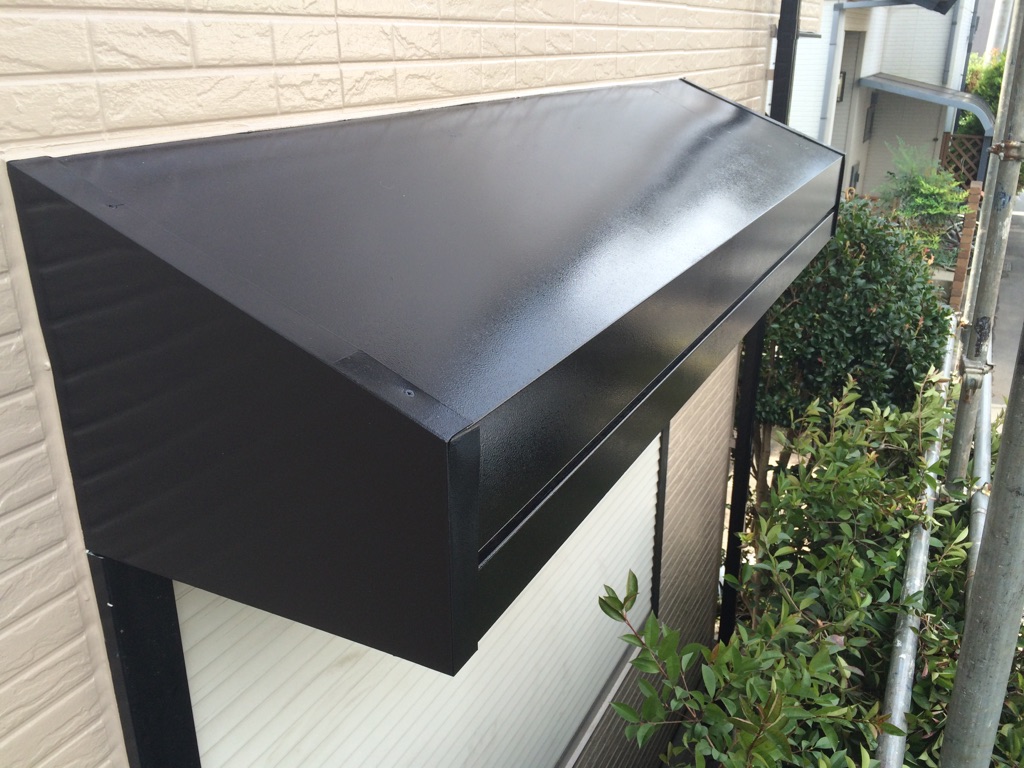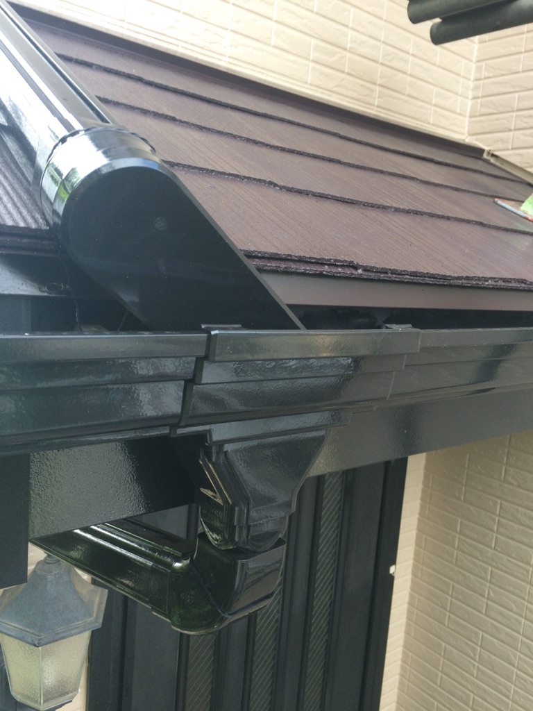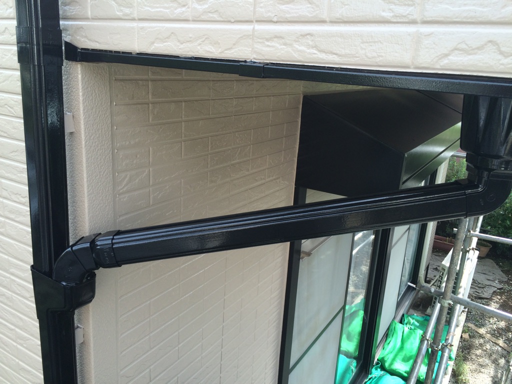 養生を外しながら 破風板、雨樋及びシャッターボックス等の塗装をマイルドシリコンにて。